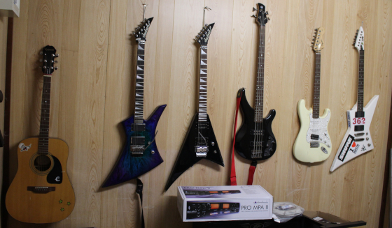 From left to right. Gibson Epiphone Acoustic, Jackson Kelly KE-3, Jackson RR-3, Ibanez active bass, Squier Strat, ESP LTD EX-360